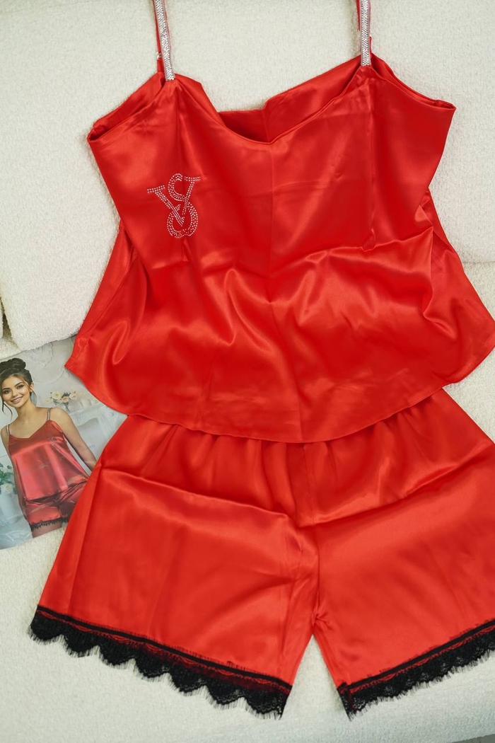 ست تاپ شورتک ساتن نگینی قرمز کد1032