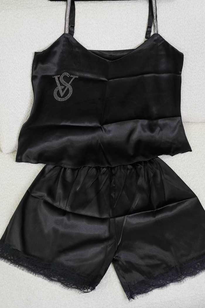 ست تاپ شورتک ساتن نگینی مشکی کد1039